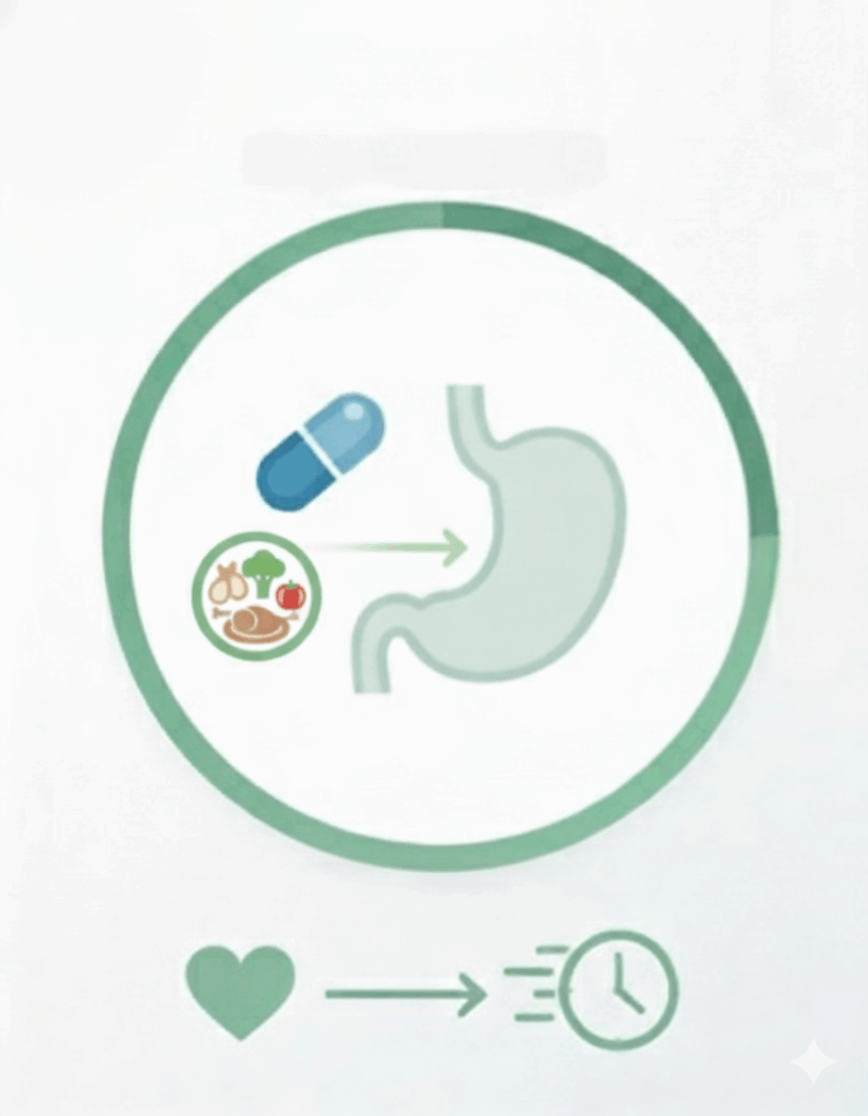 Pokarm może zmienić pH soku żołądkowego, opóźnić opróżnianie żołądka, związać substancję czynną lub zwiększyć wchłanianie leków rozpuszczalnych w tłuszczach. Dlatego sposób przyjmowania leku ma duże znaczenie.