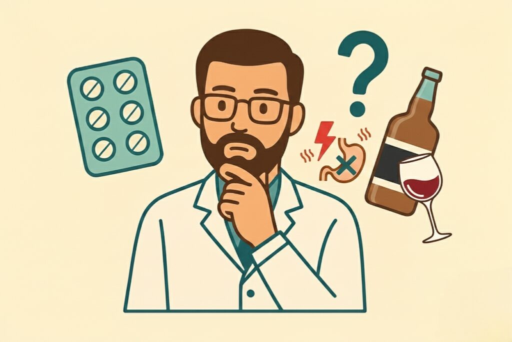 Nigdy nie popij leków alkoholem – to zawsze zwiększa ryzyko interakcji. W przypadku leków działających na OUN, depresyjnych lub o wąskim indeksie terapeutycznym – unikaj alkoholu przez cały okres przyjmowania.